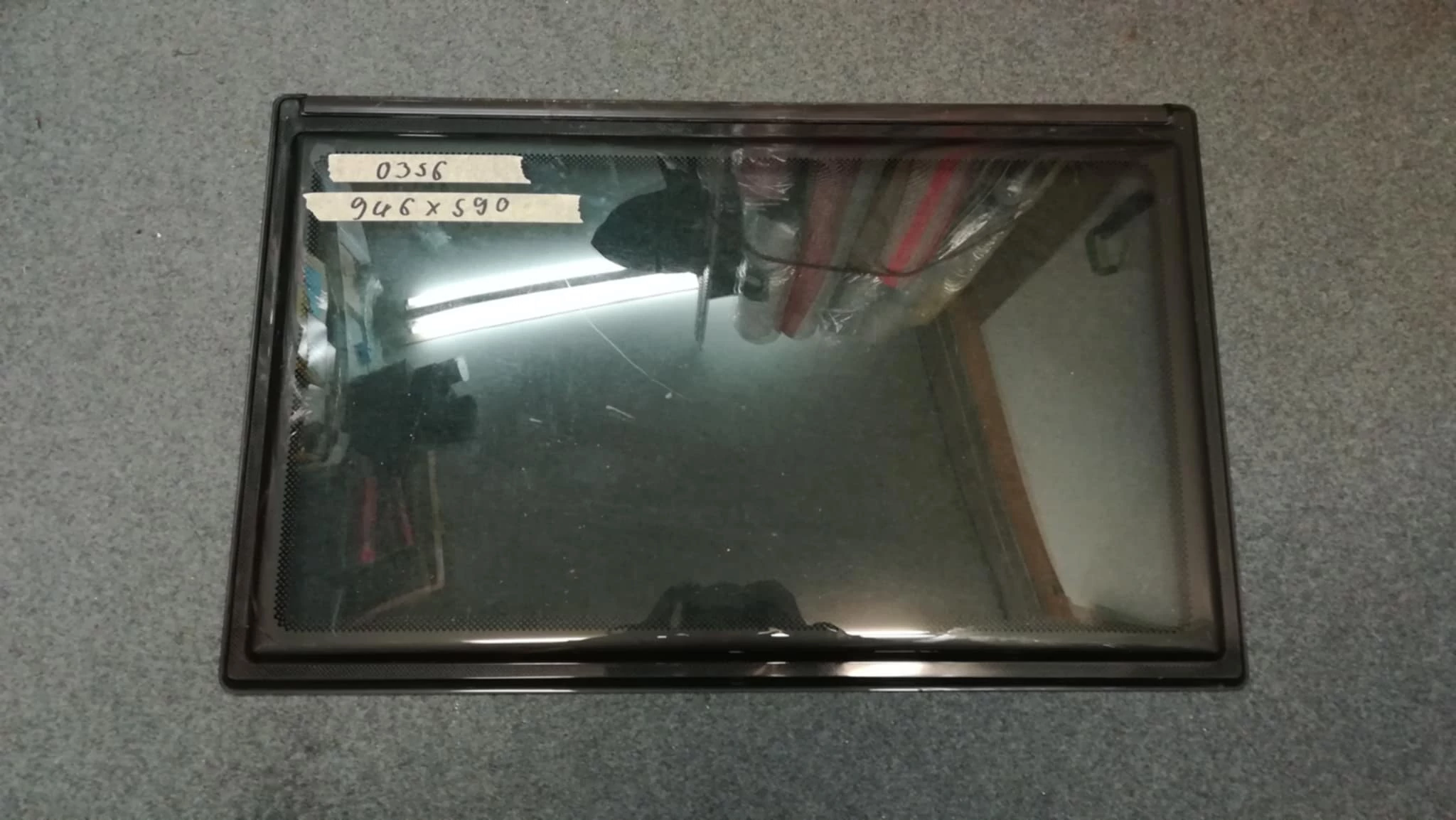 | 946 mm x 590 mm, belül repedt. | |