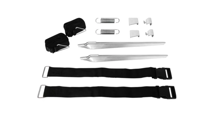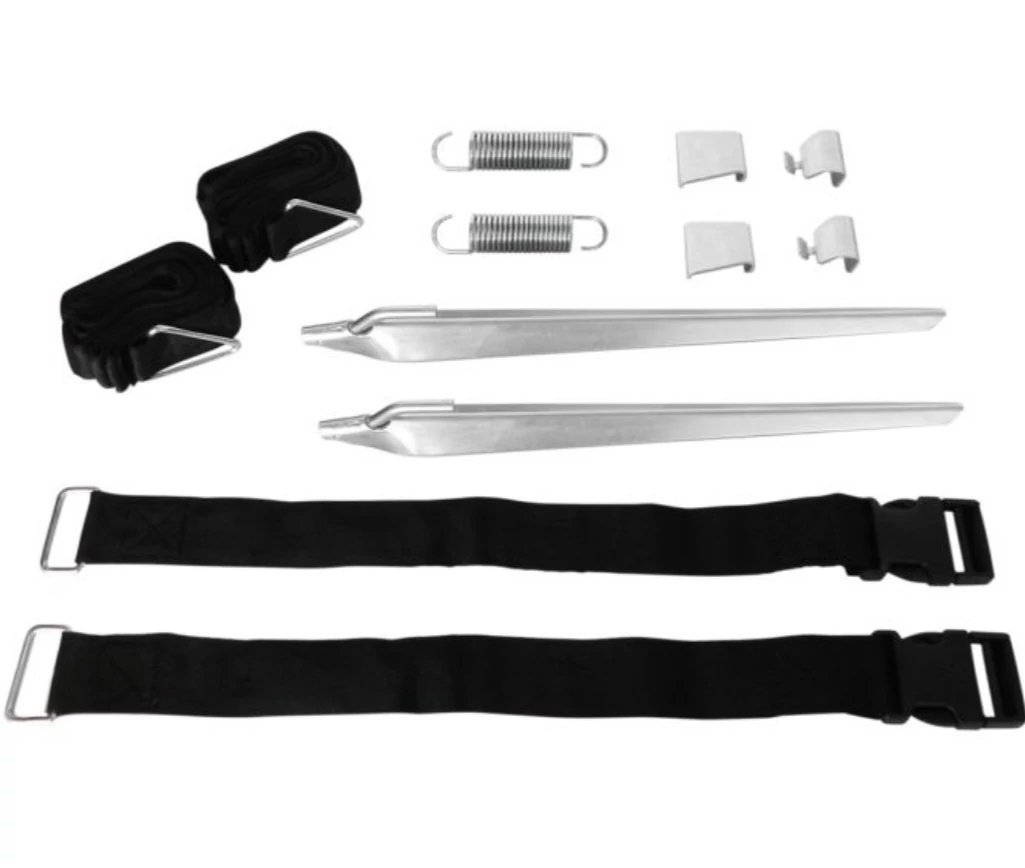 2 db feszítőpánt, 2 db feszítőrugó, 2 db csap, 2 különböző adapter Fiamma napellenzőkhöz. A Caravanstore adapter a caravanstore/F35 Pro napellenző támasztólábaira akasztható.
